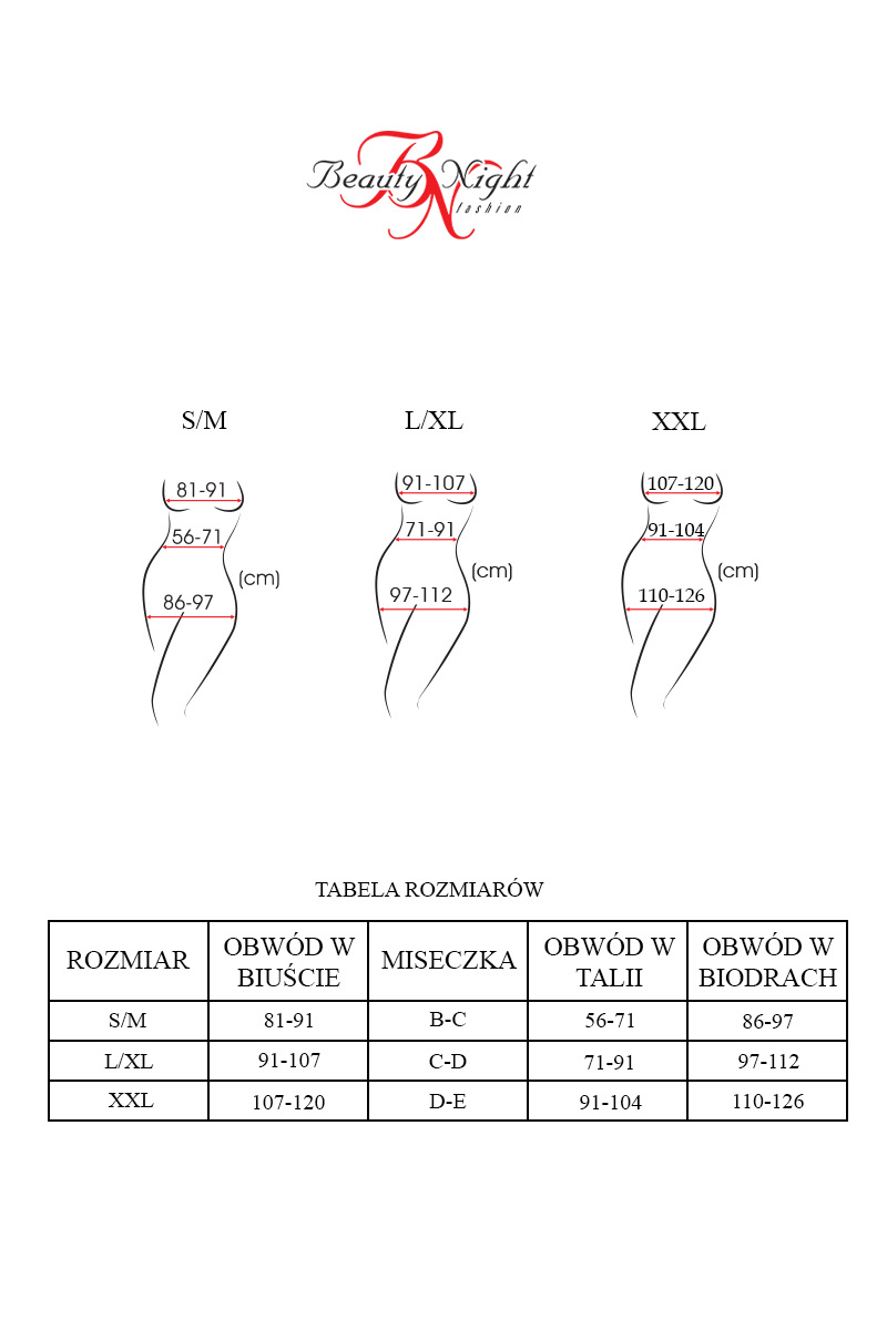 Rozmiar S/M najlepiej prezentuje się na paniach o wymiarach: Biust: 81-91cm, Miseczka B/C, Talia: 56-71cm, Biodra: 86-97cm