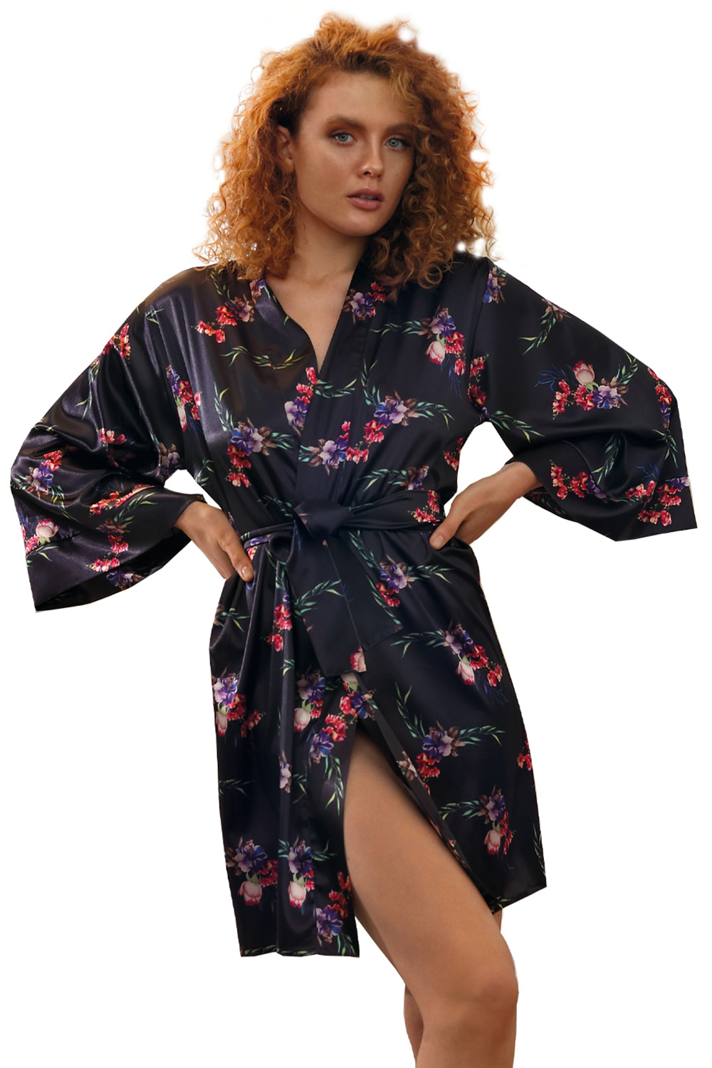 Kobiecy peniuar z kolekcji Flowers. - wykonany z kwiecistej satyny - prosty, klasyczny krój - szerokie rękawy długości 3/4 - wiązany w pasie - długość mini - idealna propozycja na prezent Skład: 100% poliester.
