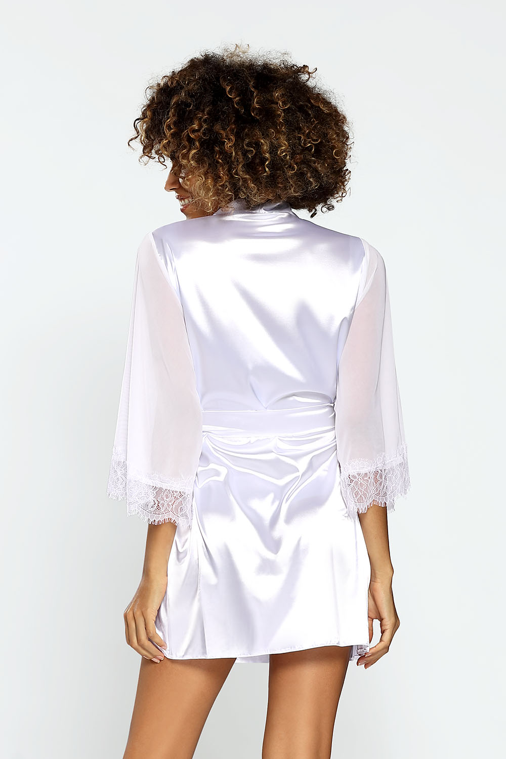 Biały, satynowy szlafrok, z rękawami z tiulu i koronki. Elegancki i zmysłowy, z pewnością i Ty będziesz w nim świetnie wyglądać. Rękawy lekko luźniejsze, ala kimono, w modnej długości 7/8. Tiul ślicznie wykończono koronką przy nadgarstkach. Talię podkreślisz paskiem, który dołączono do zestawu.