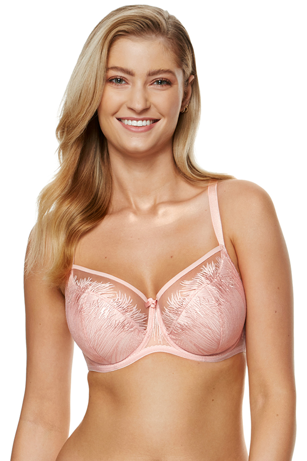 Niezwykle kobiecy biustonosz półusztywniany w różowym kolorze.