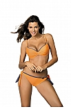 Gładki, dwuczęściowy kostium kąpielowy, który dopełnia wzorzysta lamówka. I świetna kolorystyka. Bardzo kobiecy. Miseczki biustonosza zostały profesjonalnie wymodelowane i usztywnione - dobrze zbierają piersi do dekoltu, unoszą je, a dzięki fiszbinom i wypełnieniu push, optycznie dodatkowo je powiększają. Linia dekoltu typu plunge - lekko pogłębiona, ale wciąż bardzo elegancka, wyważona. Ramiączka o regulowanej długości. Obwód tym razem jest wygodnie wiązany na plecach. Figi wiązane po bokach. Kostium prezentuje się naprawdę świetnie. Zapewni Ci pełną wygodę na plaży.