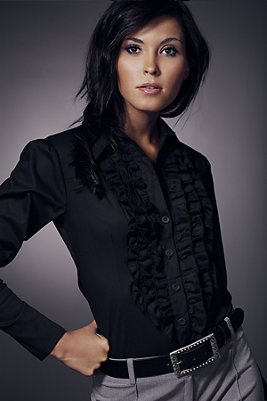 Klasyczna bluzka koszulowa w czarnym kolorze z długim rękawem. Przód zapinany na guziczki, przyozdobiony żabotem. Rękaw wykończony eleganckim mankietem. Tył gładki. Bluzeczka świetnie prezentuje się na sylwetce.