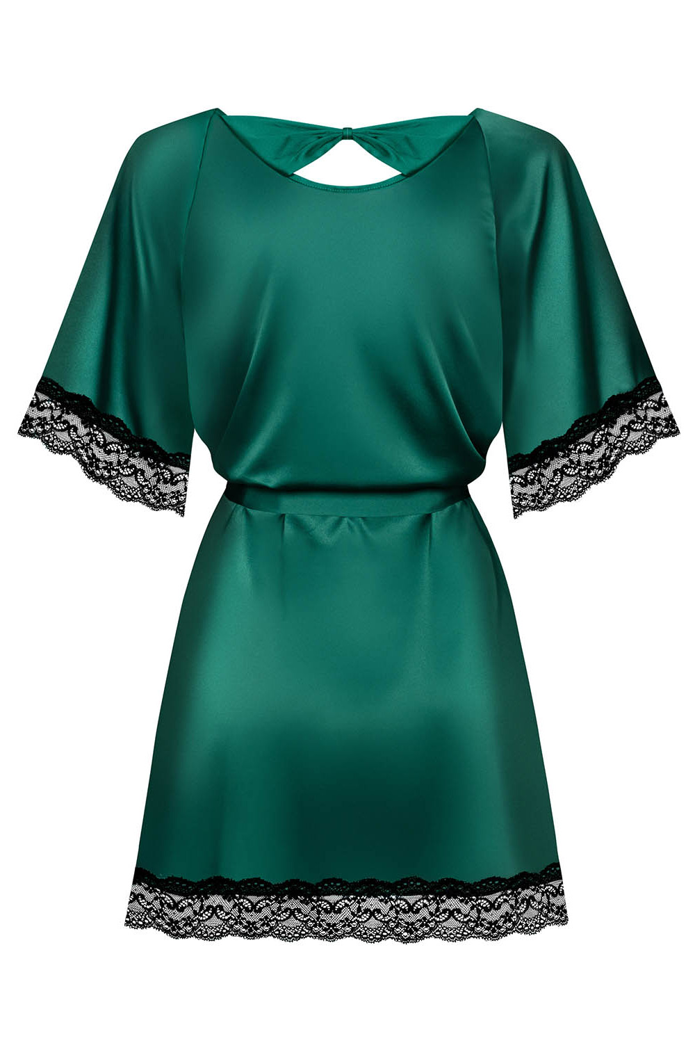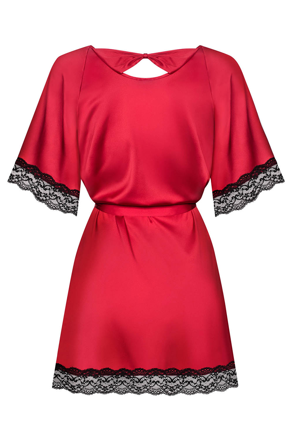 Czarne, koronkowe wykończenia dodają elegancji i kobiecości, a satynowy paseczek w talii podkreśla kobiece kształty. Skusisz się?