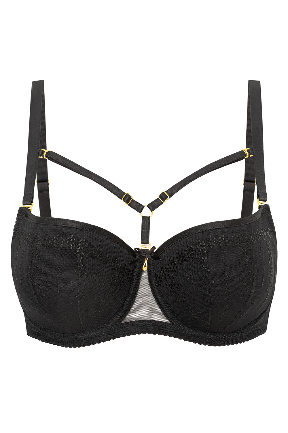 Charakterystycznym elementem są regulowane paski na dekolcie, które można w całości odpiąć, co pozwala na indywidualne dopasowanie i zmianę stylu biustonosza. Miski wykonane są z eleganckiej, wzorzystej dzianiny, a całość uzupełniają starannie dobrane detale w kolorze złota, nadające bieliźnie luksusowego charakteru. Model idealnie łączy funkcjonalność z kobiecą estetyką, podkreślając kształty i zapewniając wyjątkowy komfort noszenia.